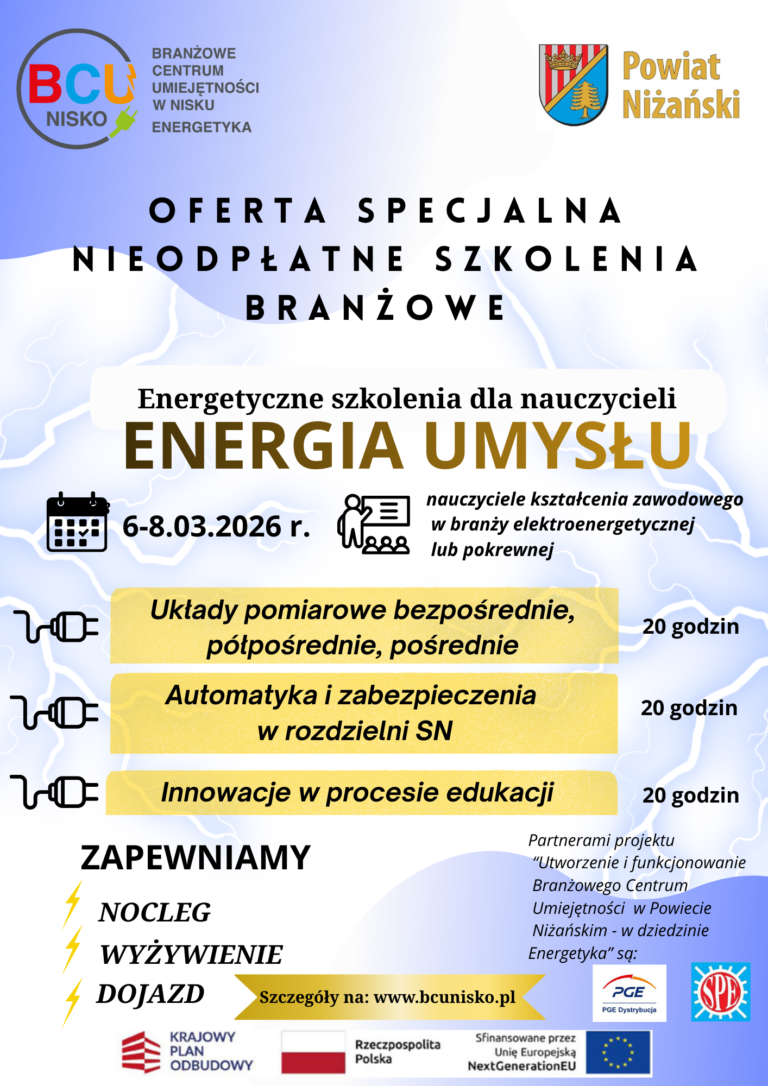 Branżowe Centrum Umiejętności w Dziedzinie Energetyki w Nisku zaprasza nauczycieli kształcenia zawodowego oraz nauczycieli praktycznej nauki zawodu w branży energetycznej, elektrycznej i pokrewnych do udziału w wyjątkowym wydarzeniu szkoleniowym:   „ENERGETYCZNE SZKOLENIA DLA NAUCZYCIELI – ENERGIA UMYSŁU” 📅 6–8 marca 2026 r. Szkolenia realizowane będą w formie branżowych szkoleń zawodowych, zgodnie z art. 3 pkt...